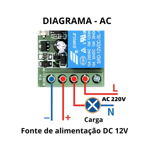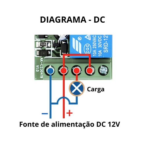 - Alimentação em 12V DC com corrente máxima de chaveamento de 10A.